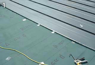 無落雪屋根等の場合、当社は「平成ルーフ標準仕様」を推薦しています。旧来の「蟻掛葺き455」より防水性能の高い製品で、教育を受けた職人による施工で高い完成度が魅力です。写真2は手作業によるハゼ締め施工で、防水効果を高めるのに欠かせない作業です。